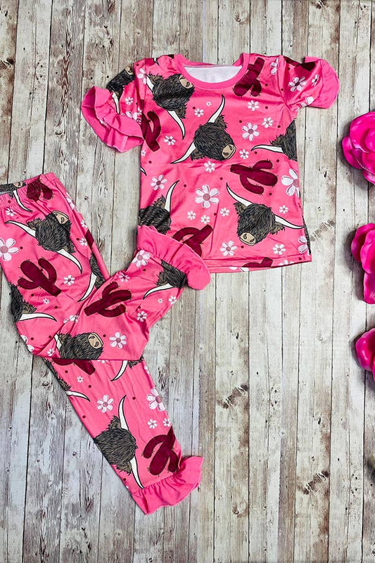 Youth Pink Cow Ruffle Pajamas - printed two piece girls pajamas sets